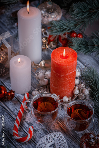 A couple of burning candles and glass cups of tea. Still life composition with christmas decoration on rustic background 7