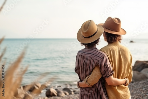 A couple of people gay standing on top of a beach