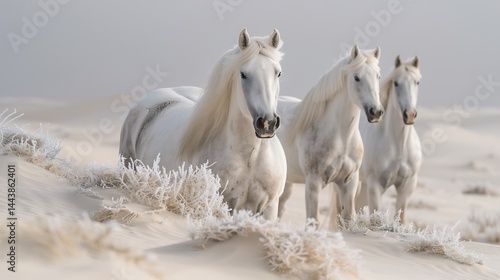 A couple of White English stallion stands solitary in frost covered sand in the desert