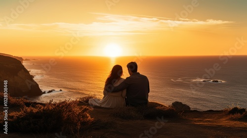 A couple sharing a romantic moment as they watch the sunset from a seaside cliff