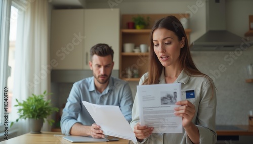 A couple sitting in their kitchen, looking over financial documents and discussing their bills, creating a scene of everyday life and budgeting. The image highlights family, finance, and communication