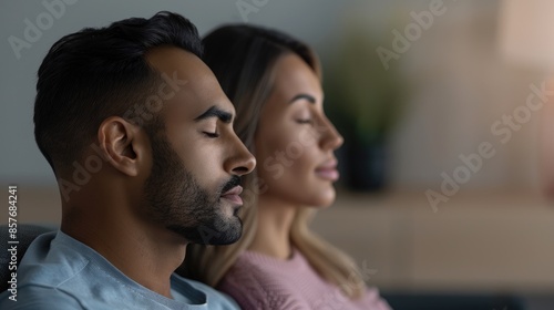 a couple sitting on a sofa in a counseling room, side by side with their eyes closed, in a counseling center