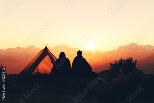 A couple sitting outside their tent, wrapped in blankets, watching the sunset over distant mountain ranges