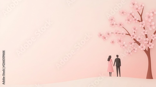 A couple stands together under a pink tree, surrounded by a soft, pastel background, evoking feelings of romance and serenity.