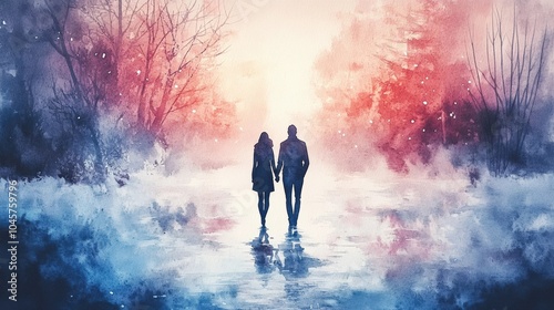 A couple walks hand in hand on a misty path, surrounded by ethereal trees and a colorful, dreamy sky