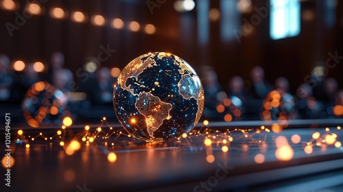 A courtroom Earth where glowing treaties and financial spikes intersect, global financial market, policy-meets-finance