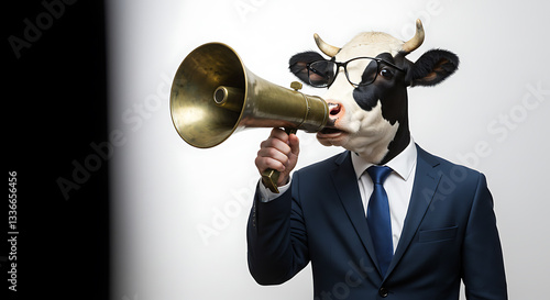 A Cow Wearing a Suit and Glasses Holding a Bullhorn Speaker and Shouting Loudly in It, Looking in Camera on Solid White Background, Medium Shot, Studio Lighting