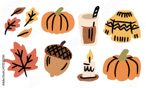 A cozy and cute illustration of fall season elements. Perfect for decorating invitations, greeting cards, website design, and other creative projects.