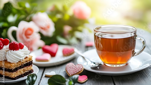 A cozy and romantic Valentine s Day tea party scene featuring a cup of tea heart shaped cakes or pastries and pastel floral on a wooden table
