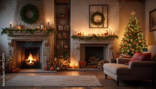 A cozy and warm fireplace with festive holiday decorations and a Christmas tree, snug atmosphere, festive lights, peaceful background