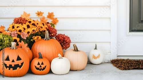 A cozy autumn scene featuring carved pumpkins and vibrant flowers on a porch, perfect for Halloween festivities.
