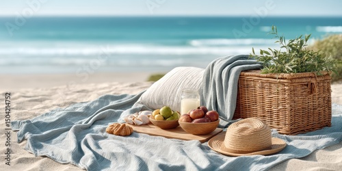 A cozy beach picnic setup with a basket, fresh fruit, bread, milk, a hat, and a blanket overlooking the ocean on a sunny day.