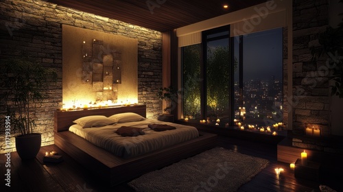 A cozy bedroom adorned with soft candles, a plush bed, and a large window, creating a romantic atmosphere perfect for Valentine's Day.