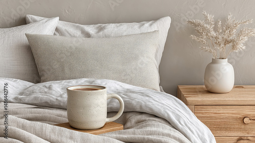 A cozy bedroom scene with a mug on bed, vase, and bedside table