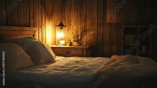 A cozy bedroom with a rustic wooden nightstand and a soft glowing lamp, casting warm light on the bed and walls. The room exudes comfort and calmness.