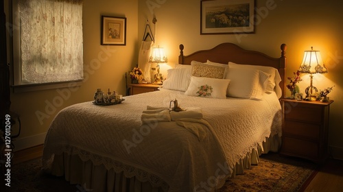 A cozy bedroom with a soft, warm color palette, a neatly made bed, and romantic lighting