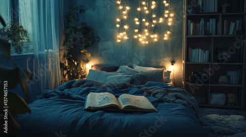 A cozy bedroom with layered blue textiles, an open book, and soft lighting. A tactile mix of fabrics and modern decor details enhance the warm, inviting feel.