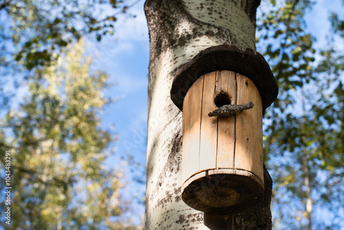 A cozy birdhouse adorns the trunk of a stately birch tree in this enchanting park scene
