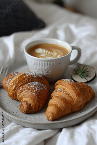A cozy breakfast scene with a cup of coffee with latte art and two fresh croissants on a ceramic plate, adorned with a sprig of greenery.