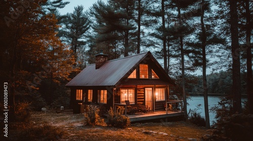 A cozy cabin by a serene lake, illuminated at dusk, surrounded by tall trees.