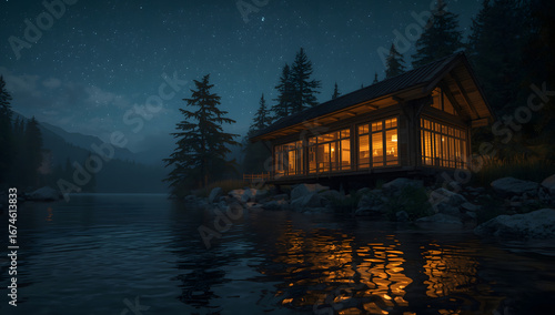 A cozy cabin illuminated at night, reflecting in the tranquil lake water, under a starry sky.