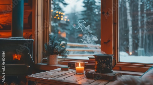 A cozy cabin interior with a wood burning stove and a view of a snowy winter landscape outside the window
