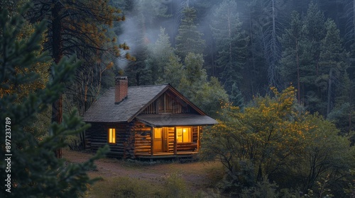 A cozy cabin with smoke rising from the chimney, surrounded by trees