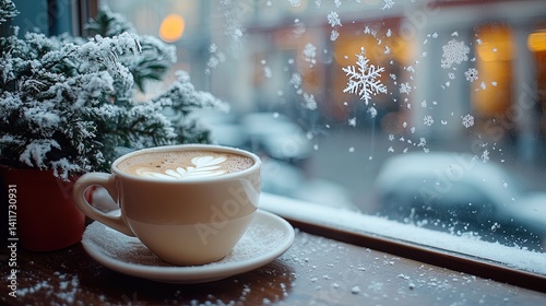 A cozy café with snowflakes drifting outside the window, and a steaming cup of coffee on the table