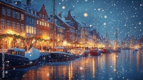 A cozy Christmas scene at Nyhavn, Copenhagen, the entire waterfront glowing with colorful holiday lights, boats covered in snow docked along the canal. Historic houses adorned with festive garlands,