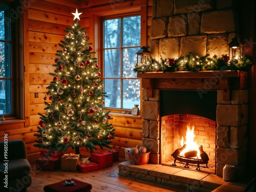 A cozy Christmas scene inside a wooden cabin, featuring a beautifully decorated Christmas tree and a warm, inviting fireplace, capturing the essence of holiday warmth and cheer.