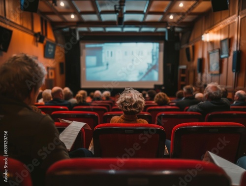 A cozy cinema hall with a blank wide screen rows of red seats