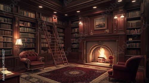 A cozy Colonial library with floor-to-ceiling bookshelves, a rolling ladder