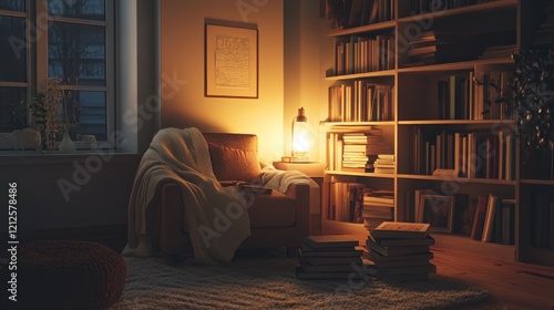 A cozy corner of a bedroom with a reading nook, complete with a comfy chair, a stack of books, and a small lamp casting a gentle glow.