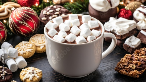 A cozy cup of hot chocolate topped with marshmallows, surrounded by festive treats and decorations, evoking a warm holiday spirit.