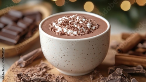A cozy cup of hot chocolate topped with whipped cream and chocolate shavings.