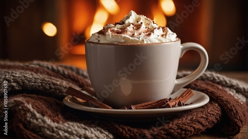 A cozy cup of hot cocoa with a creamy texture, perfect for warming up on a cold day, surrounded by a warm atmosphere