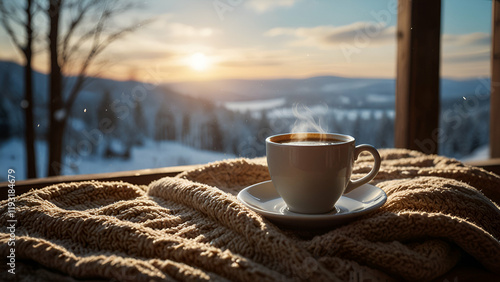 A Cozy Cup of Hot Tea on a Warm Blanket with Snowy Mountain Views on Winter Day