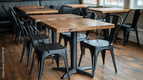 A cozy dining area featuring wooden tables and black metal chairs, perfect for casual gatherings and dining experiences.