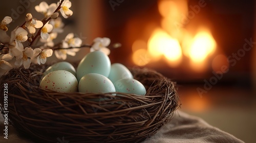 A cozy Easter evening by a crackling fire, pastel eggs in a woven basket, and a warm, inviting ambiance. --ar 16:9 --stylize 150 --v 6.1 Job ID: 078b9ea7-4530-4551-b8a8-d108273a7efb