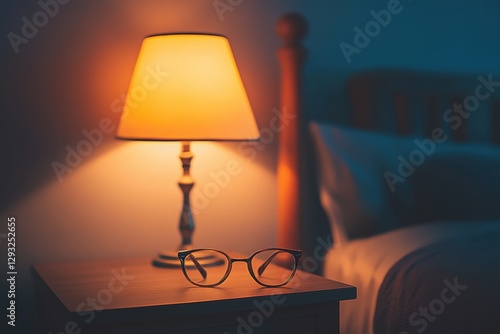 A cozy evening scene featuring eyeglasses on a sleek wooden stand next to a warm lamp in a serene bedroom setting capturing relaxation and comfort