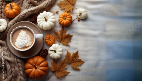 A cozy fall corner with small pumpkins, cozy knit, and a cup of coffee capturing autumns charm and warmth. Generative AI