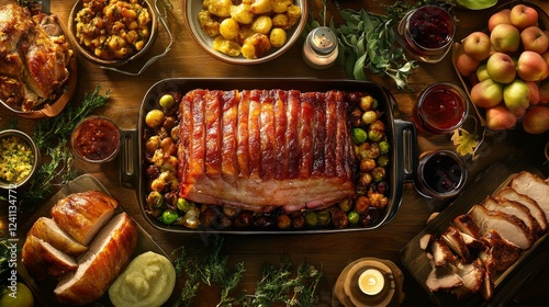 A cozy family gathering with a platter of roasted pork belly at the center of the table, surrounded by laughter, conversation, and delicious sides.