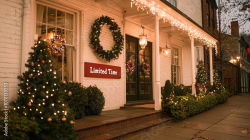 A cozy, festive storefront adorned with holiday decorations, wreaths, and lights, creating a warm and inviting atmosphere.