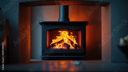 A cozy fireplace with a lit fire burning inside, set within a fireplace hearth. Warm ambiance and heating element. The image of a fireplace.
