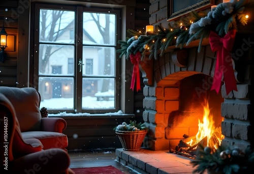 A cozy fireplace with a mantel decorated with Christmas ornaments and candles, in front of a snowy winter landscape visible through a window, a christmas present near the fireplace