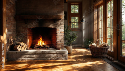 A cozy forest villa interior with a warm fireplace and rustic wooden decor.