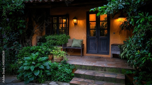 A cozy home entrance is surrounded by lush green vegetation