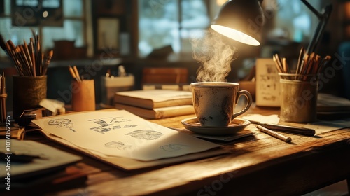 A cozy home office setup with a steaming cup of coffee on a rustic wooden desk, surrounded by artistic sketches and design tools,