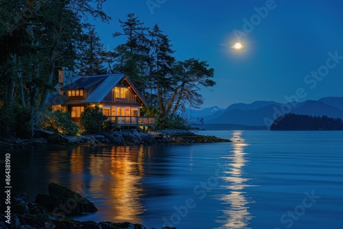 A cozy house on the edge of an island in Washington, surrounded by water and trees at night with moonlight reflecting off the ocean's surface, creating long shadows Generative AI