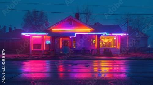 A cozy house with vivid neon lights in shades of pink, purple, and blue reflected on a wet street, creating a surreal and cinematic atmosphere. AI generated.